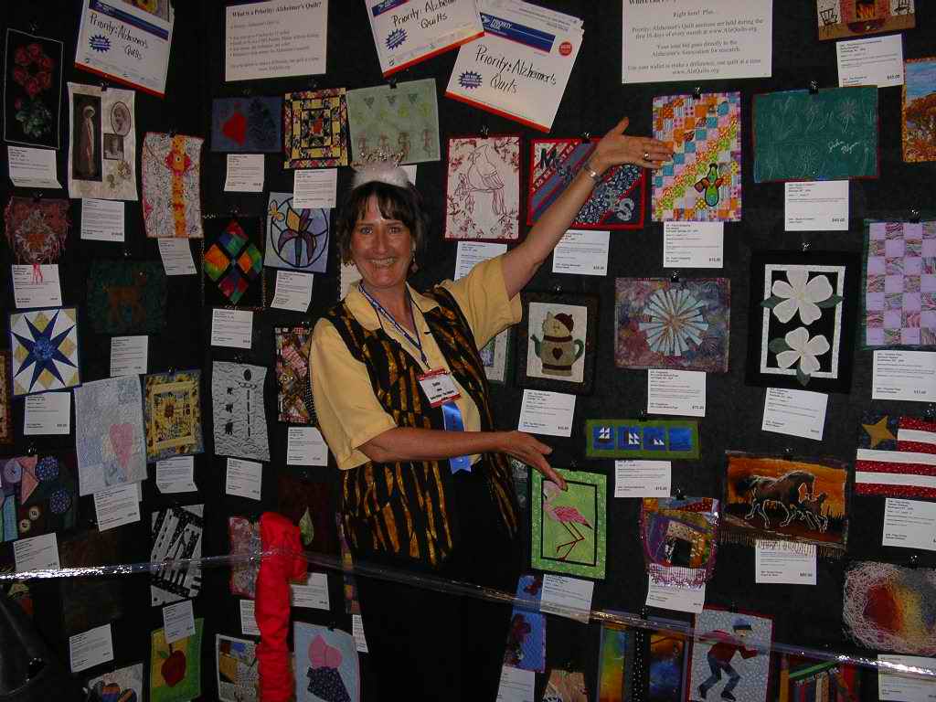 We had booth at the Houston show, and met many, many friends and fans from all over the world. We saw lots of astounding quilts, too, since Houston is one of the most prestigious quilting events in North America. And I even got the chance to be "Vanna White" for an hour for Ami Simms at the Alzheimer's Art Quilt Initiative display there. She raised thousands of dollars for the cause during the week. It was very exciting to be a part of it. For everyone who bought a quilt while I was "on duty", I composed a song on the spot about their new quilt. Can you spot the tiara?