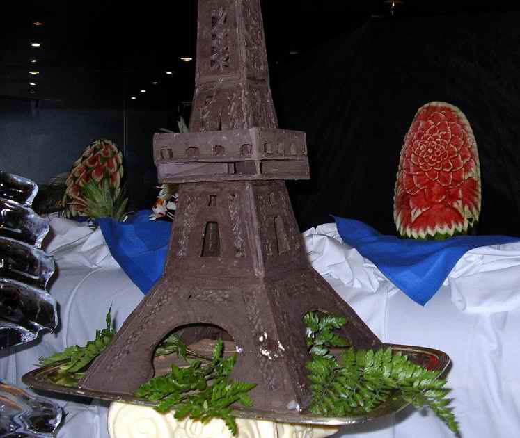 Chocolate Eiffel Tower with carved watermelon behind